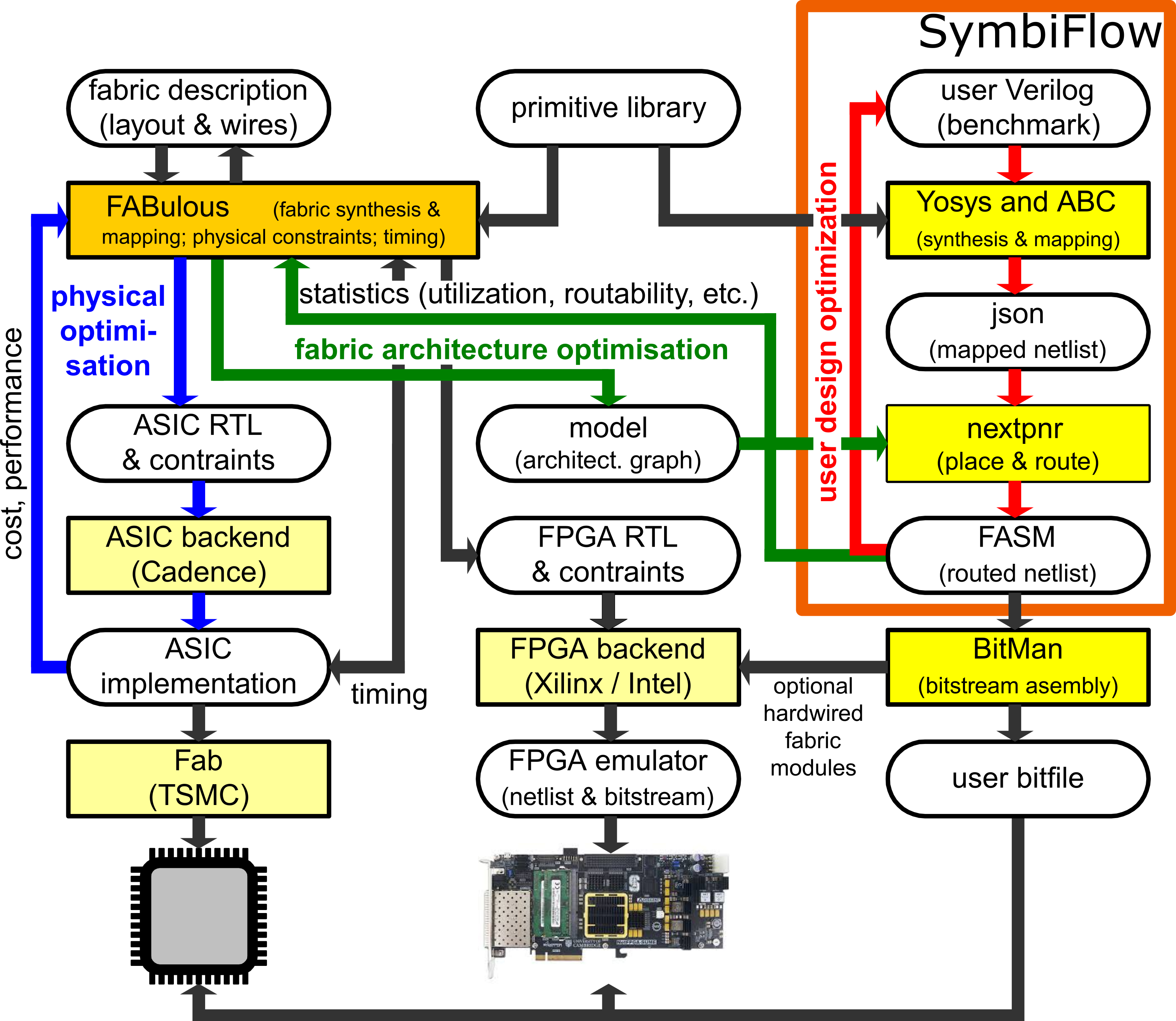 The FABulous ecosystem generates the embedded FPGA fabric for chip fabrication, integrates SymbiFlow toolchain release packages, deals with the bitstream generation and after fabrication tests. Additionally, we will provide an emulation path for system development.