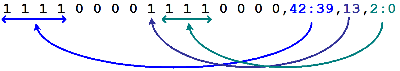 entries and use that value while <bits_used> is used for checking only.<ConfigBits_ranges> denotes a comma-separated list of configuration bits (given by their index) from the tile bitstream. The field can be individual bits or ranges of tile bitstream bits in the form <left_index>:<right_index>. The number of specified bits has to match the number of used configuration bits as specified by the mask and the mapping is performed in the order the configuration bits are listed, as illustrated in the following figure: