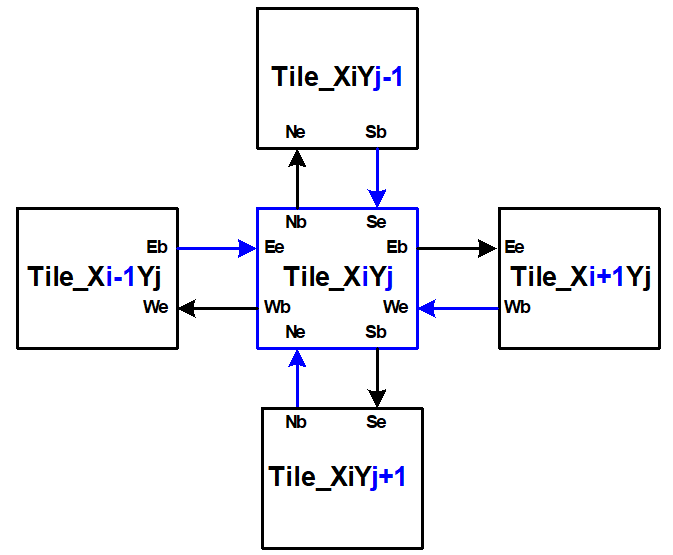 If a basic tile has a border to the outside world (i.e. the surrounding fabric), the interface to that border is exported to the supertile interface (i.e. the Entity in VHDL). Those borders are marked blue in the figure above. Internal edges are connected inside the supertile wrapper according to the entire tile specification.