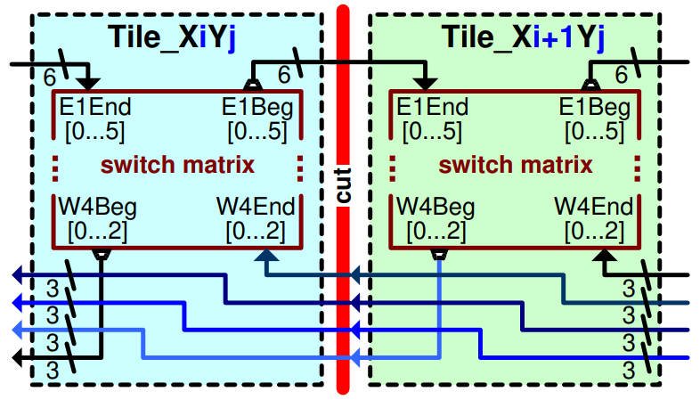 Supertiles are needed for blocks that require more logic and/or more wires to the routing fabric (e.g., as needed for DSP blocks). Therefore, supertiles will normally provide as many switch matrices as they integrate basic tiles. However, larger supertiles (e.g., hosting a CPU or similar) may only provide switch matrices in basic tiles located at the border of such a supertile In any case: supertiles must provide wire interfaces that match the surroundings when stitching them into a fabric.